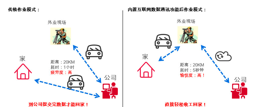 打破传统城市测量模式必须回到公司才能进行数据传输的定局,新一代TZ系列全站仪能够随时随地的实现数据成果分享,测量结束后直接收工回家,大大降低工作强度,感受更加愉悦、轻松的测量体验!